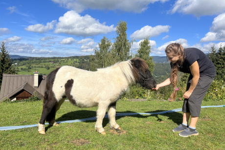 Oskar byl náš první shetland. Koupili jsme ho v létě roku 2008. Přetrpěl všechny naše přehmaty a přesto nás měl rád. Byl to vyrovnaný, nelekavý, klidný, mírný a mlsný shetík. Byl spolehlivým jezdeckým poníkem pro našeho Vojtu. Celé léto si chodil volně po loukách kolem domu. Určil si sám svoje hranice a těch se držel. Kontroloval sousedy i procházející turisty, zda nenesou něco dobrého.